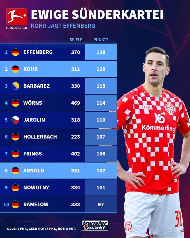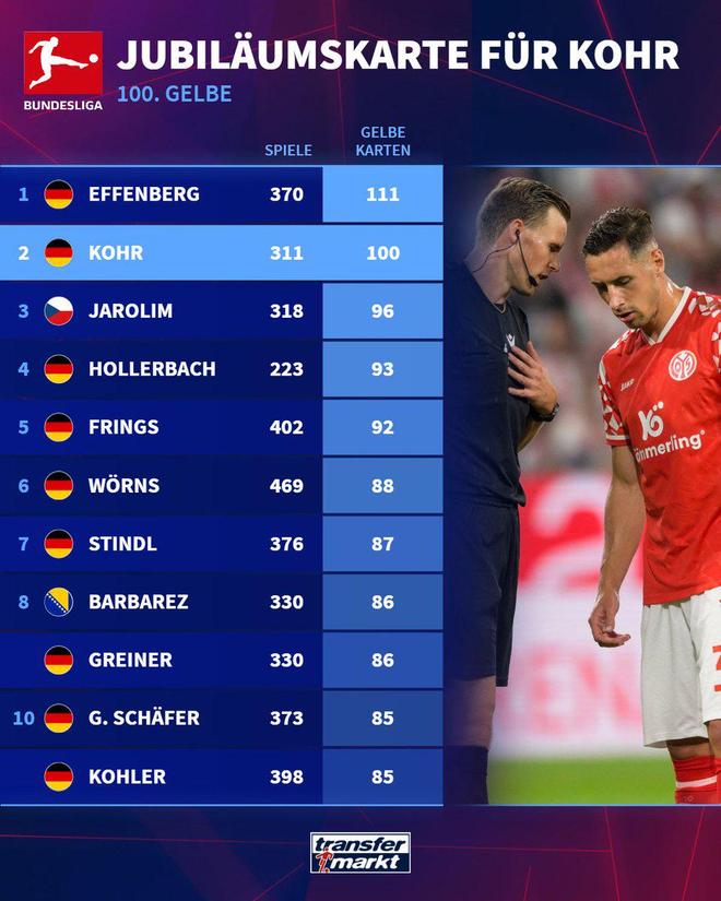 據(jù)德甲官方統(tǒng)計(jì),這是科爾德甲生涯第100張黃牌,他也因此成為德甲歷史上第二位黃牌數(shù)破百的球員。在此之前,唯一達(dá)到這一里程碑的還是拜仁傳奇“老虎”埃芬博格——這位拜仁名將在370場(chǎng)德甲比賽中累計(jì)吃到111張黃牌。