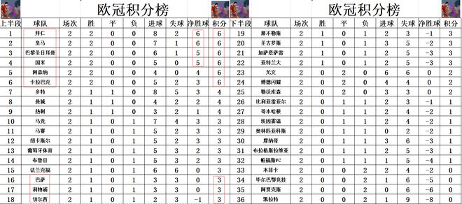 積分榜方面,2輪戰(zhàn)罷只剩下6支球隊(duì)保持全勝,分別是拜仁,皇馬,巴黎,國(guó)米,阿森納和卡拉巴克。拜仁1個(gè)進(jìn)球優(yōu)勢(shì)力壓皇馬領(lǐng)跑,巴黎則是1個(gè)進(jìn)球優(yōu)勢(shì)超過(guò)國(guó)米升至第3,阿森納差國(guó)米1個(gè)凈勝球排在第5。巴薩被絕殺后排名下滑,剛好排在利物浦和切爾西之前位列第16。