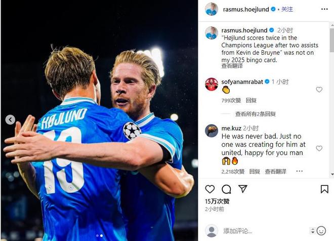 雷速體育10月2日訊 北京時間今天凌晨,在歐冠聯(lián)賽階段第二輪比賽中,那不勒斯憑借霍伊倫的梅開二度,主場2-1戰(zhàn)勝葡萄牙體育,取得寶貴三分。值得一提的是,霍伊倫打入的兩個進(jìn)球,都來自前曼城球星德布勞內(nèi)的助攻。賽后霍伊倫在社交網(wǎng)站上寫道:“霍伊倫在歐冠梅開二度,而助攻者竟是德布勞內(nèi)——這劇情,我在2025年的 bingo卡(預(yù)測卡)上可完全沒寫啊!”
