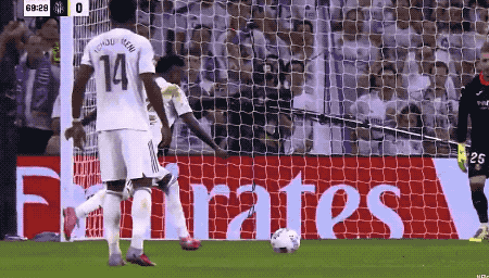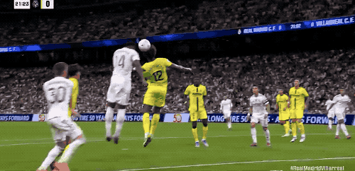1分鐘后,皇馬的進攻如潮水般再次來襲,維尼修斯傳中,瓊阿梅尼高高躍起,頭槌攻門,皮球差之毫厘。