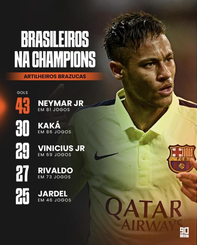 維尼修斯(Vinicius Junior)場次:69進球:59助攻:25場均進球:0.43場均助攻:0.37榮譽:歐冠冠軍2次(2021/22、2023/24 皇家馬德里)里瓦爾多(Rivaldo)場次:73進球:27助攻:11場均進球:0.37場均助攻:0.15榮譽:歐冠冠軍1次(2002/03 AC米蘭)