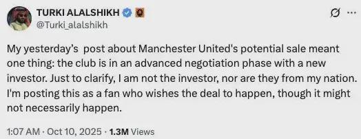 沙特著名投資人、現(xiàn)任沙特娛樂總局的負(fù)責(zé)人Turki Alalshik有參股曼聯(lián)的沖動(dòng),敏銳的英國媒體立馬展開了各類報(bào)道,不出意外地把水?dāng)嚋喠恕,F(xiàn)在這事兒越發(fā)撲朔迷離了?!剁R報(bào)》昨晚(北京時(shí)間)報(bào)道,格雷澤家族考慮出售他們?cè)诼?lián)的股份,報(bào)價(jià)需超過50億英鎊,Turki Alalshik正在準(zhǔn)備收購。《鏡報(bào)》今早則報(bào)道,人家又親自出面澄清,否認(rèn)自己或任何沙特投資方參與收購曼聯(lián)談判。