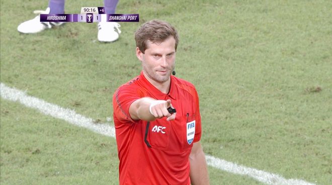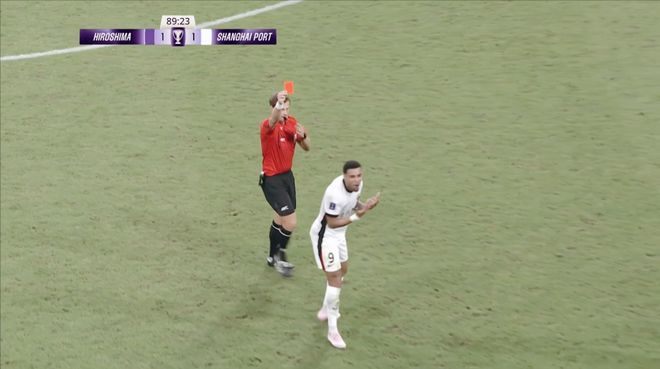 我們將思緒再度拉回上輪亞冠精英賽。上海海港客場挑戰(zhàn)廣島三箭,比賽來到常規(guī)時間的最后一分鐘,上海海港后場斷球準備快速反擊,萊昂納多一腳直塞找前場插上的古斯塔沃。古斯塔沃面對兩人的夾防,為了快速擺脫防守,對抗中推倒了荒木隼人。主裁判亞歷山大金在猶豫了幾秒之后,直接向古斯塔沃出示紅牌,將其罰出場!
